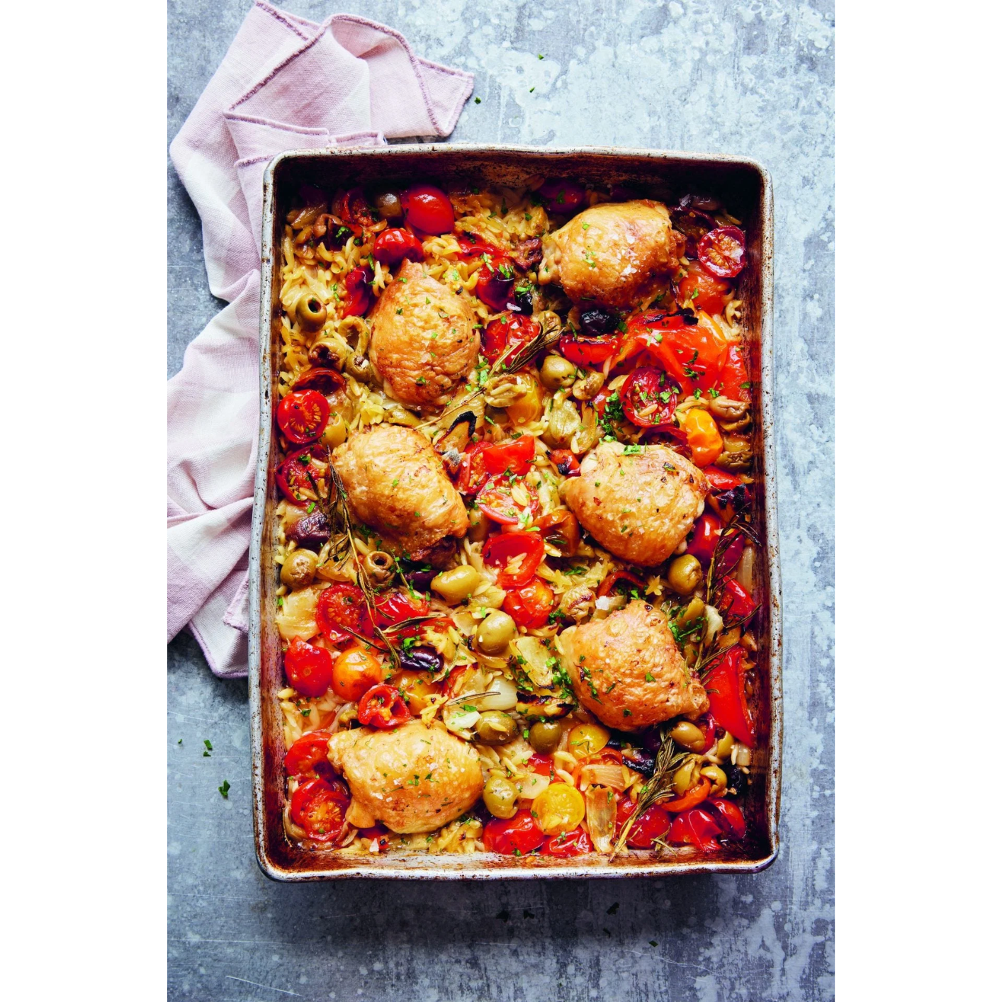 Taken from The Shortcut Cook: All in One by Rosie Reynolds, it’s practical cooking at its best. The orzo cooks directly in the sauce so no separate pan of boiling pasta, soaking up white wine, tomatoes, olives and rosemary, while golden chicken thighs finish on top. It feels generous and deeply comforting, but requires very little from you beyond a quick prep and the occasional stir.