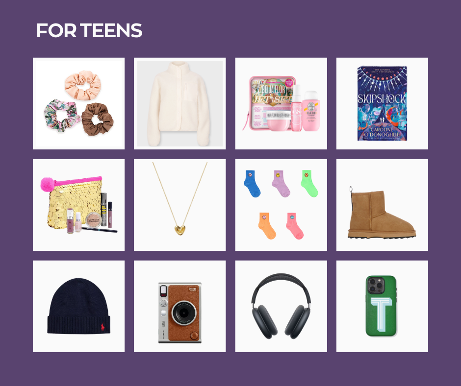 SleepSmug – Cloud Satin Scrunchie Set, Caramel Tiger (£10) - A set of silky oversized scrunchies in caramel, mocha and tiger print that they’ll love wearing out and about or keeping their hair in good condition tied up overnight. Shop here
