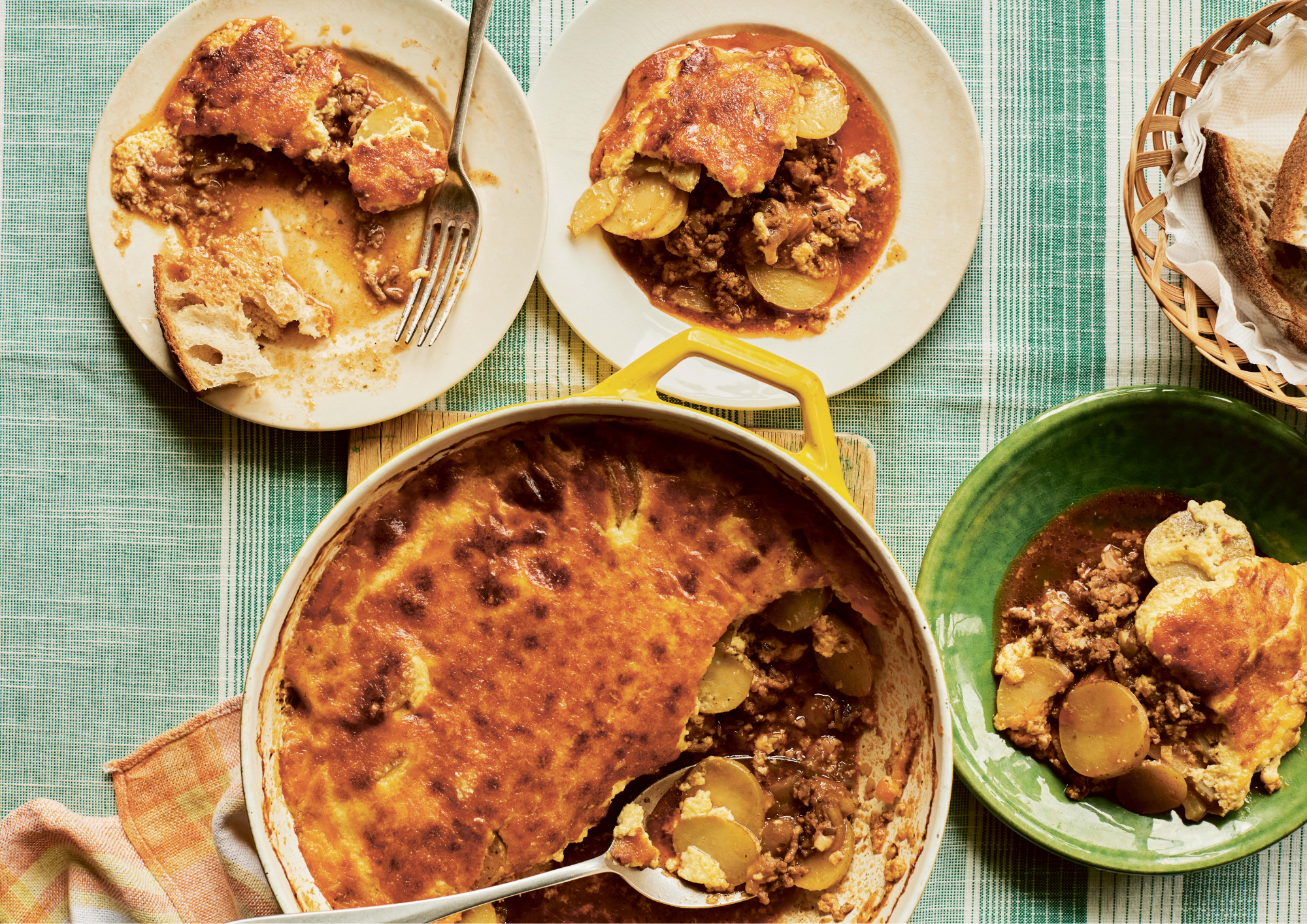 Layer the potatoes over the meat mixture. Season, drizzle with olive oil and bake covered for 30 minutes, removing the lid for the final 10 minutes.