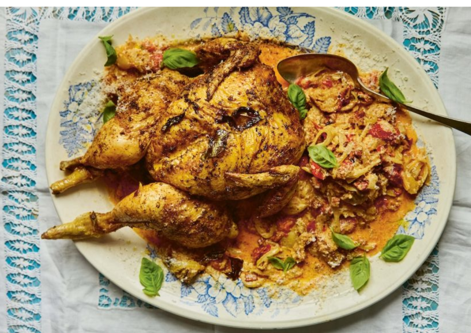 Return the chicken to the tray or serve alongside the bread mixture. Finish with remaining Parmesan and basil.